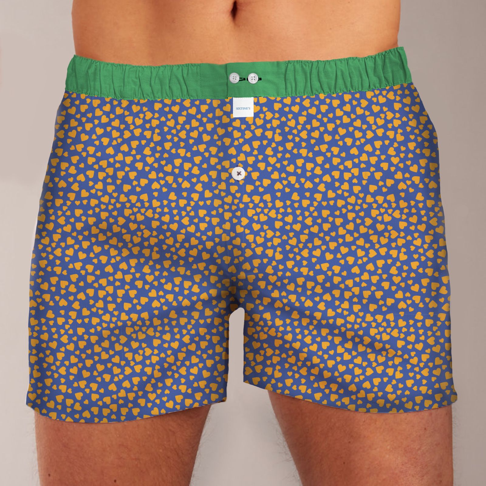 New - Elegant ocean blue boxershort with yellow heart print, combined with a pastel green waistband. The perfect boxershort for Valentine's day! ✨